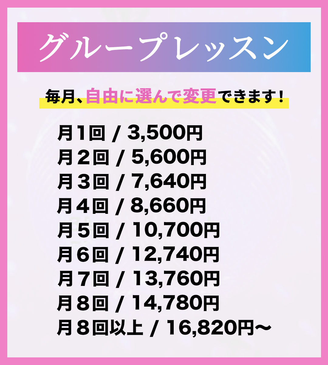 このたび、より良いレッスン環境の維持・向上を目的として、2026年2月1日以降のグループレッスン料金および体験料を改定させていただくこととなりました。